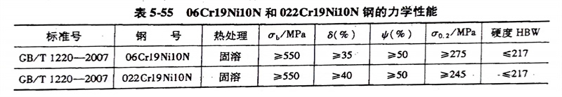 (5)力(li)學性能: 06Cr19Ni10N 鋼(gang)和022Cr19Ni10N不(bu)銹鋼(gang)的力學性能(neng)見(jian)表5-55。