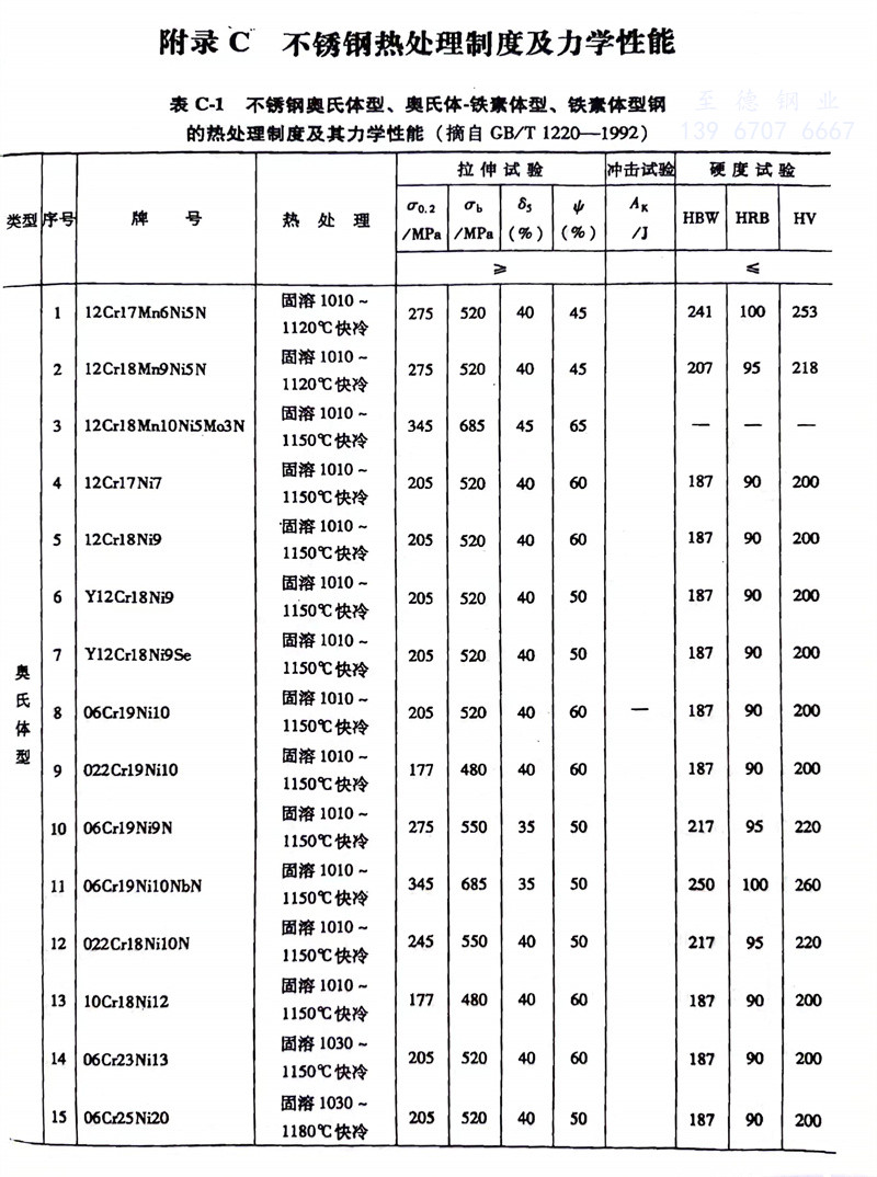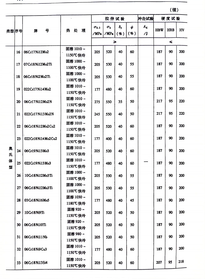 奧氏(shi)體(ti)不(bu)銹鋼、雙相不(bu)銹鋼、鐵素體(ti)不(bu)銹鋼的熱處理制度及其力學性能對(dui)照表(biao)