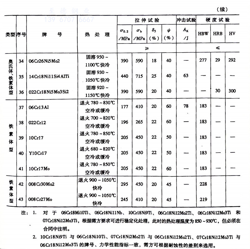 注: 1.對于(yu) 06Cr18Ni10Ti、06C18Ni11Nb、10Cr18Ni9Ti、06Cr18Ni12Mo2Ti、06Cr18Ni12Mo3Ti 和 07Cr18Ni12Mo3Ti,根據儒方(fang)要(yao)求可(ke)進行(xing)穩定化處(chu)理,此時的熱處(chu)理溫度為850~930℃,但(dan)必須在合(he)同中注明(ming)。
