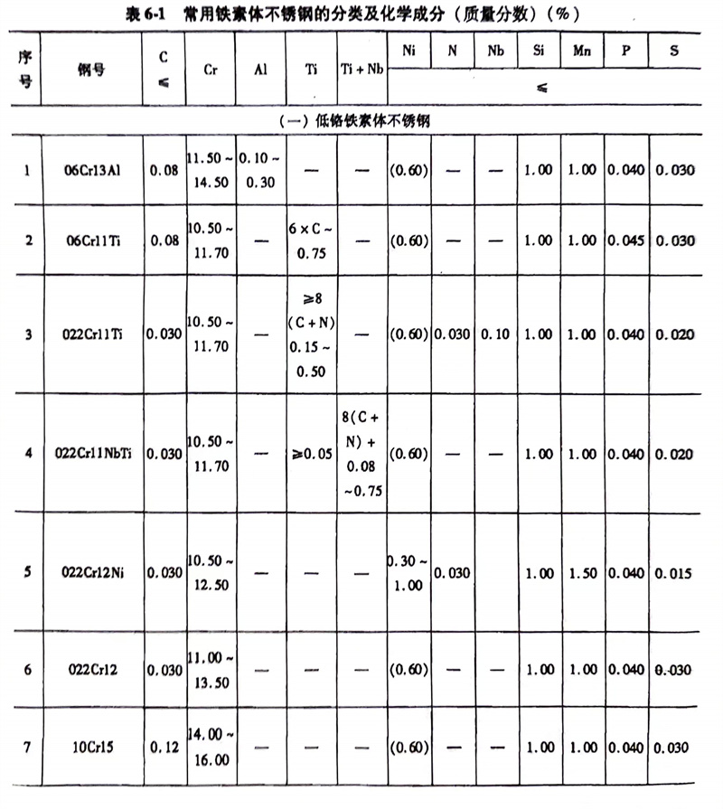 鐵素體不銹鋼的鉻含量(質量分數)一般在11%~30%,碳含量(質量分數)大多低于0.12%。一般按鋼中鉻含量的不同可分為:低鉻鐵素體不銹鋼(Cr)=11%~15%~15%、中鉻鐵素體不銹鋼(Cr)=16%~20%% 和高鉻鐵素體不銹鋼(Cr)=26%~30%%,其分類和化學成分見表6-1。