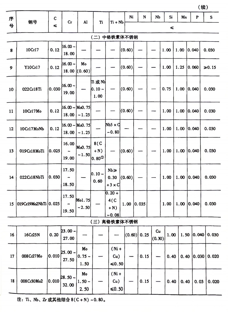 近幾十年來,隨著冶煉新(xin)技(ji)(ji)術的(de)出(chu)現(xian),鐵(tie)(tie)素體不銹(xiu)鋼(gang)的(de)性(xing)能有(you)所改善(shan),發展(zhan)了(le)許多焊(han)接性(xing)好,加工性(xing)能優良的(de)新(xin)鋼(gang)種(zhong)。在(zai)GB/T 1220-1992標準(zhun)中(zhong)鐵(tie)(tie)素體不銹(xiu)鋼(gang)僅有(you)8種(zhong),而在(zai)GB/T 20878-2007標準(zhun)中(zhong)鐵(tie)(tie)素體不銹(xiu)鋼(gang)有(you)了(le)18種(zhong)。下(xia)面(mian)浙江(jiang)至德鋼(gang)業有(you)限(xian)公(gong)司(si)技(ji)(ji)術人員分別對(dui)其性(xing)能和應(ying)用進(jin)行簡單介紹(shao)。