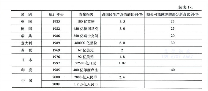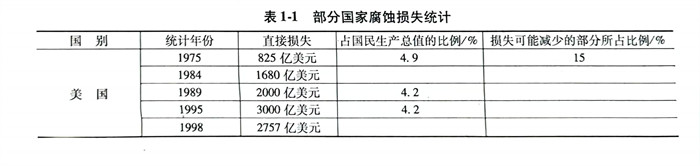 腐(fu)(fu)(fu)蝕(shi)(shi)(shi)造成(cheng)的(de)(de)(de)(de)直接經(jing)濟(ji)損(sun)失(shi)可(ke)以統計(ji)(ji)出具體(ti)數(shu)字。據(ju)(ju)發達(da)國家統計(ji)(ji),每(mei)年由(you)腐(fu)(fu)(fu)蝕(shi)(shi)(shi)造成(cheng)的(de)(de)(de)(de)直接經(jing)濟(ji)損(sun)失(shi)約占國民經(jing)濟(ji)總產值(zhi)的(de)(de)(de)(de)1%~6%,超(chao)過(guo)了每(mei)年因水災、火災、風(feng)災和(he)(he)地震造成(cheng)的(de)(de)(de)(de)損(sun)失(shi)總和(he)(he)(100多億美元)。據(ju)(ju)權(quan)威部門統計(ji)(ji),我國每(mei)年因腐(fu)(fu)(fu)蝕(shi)(shi)(shi)造成(cheng)的(de)(de)(de)(de)損(sun)失(shi)高達(da)5000多億元,相當(dang)(dang)于(yu)國民生(sheng)產總值(zhi)的(de)(de)(de)(de)4%,僅在石(shi)油和(he)(he)化學工業造成(cheng)的(de)(de)(de)(de)損(sun)失(shi)就達(da)800多億元。據(ju)(ju)統計(ji)(ji),全世界每(mei)年由(you)于(yu)腐(fu)(fu)(fu)蝕(shi)(shi)(shi)而報廢(fei)的(de)(de)(de)(de)金(jin)屬設備(bei)和(he)(he)材(cai)料相當(dang)(dang)于(yu)金(jin)屬年產量的(de)(de)(de)(de)10%~40%,其(qi)中2/3 可(ke)再生(sheng),而1/3的(de)(de)(de)(de)金(jin)屬材(cai)料被腐(fu)(fu)(fu)蝕(shi)(shi)(shi)后無法回收。從表1-1可(ke)以看出發展中國家與發達(da)國家由(you)腐(fu)(fu)(fu)蝕(shi)(shi)(shi)造成(cheng)的(de)(de)(de)(de)損(sun)失(shi)都(dou)相當(dang)(dang)大。